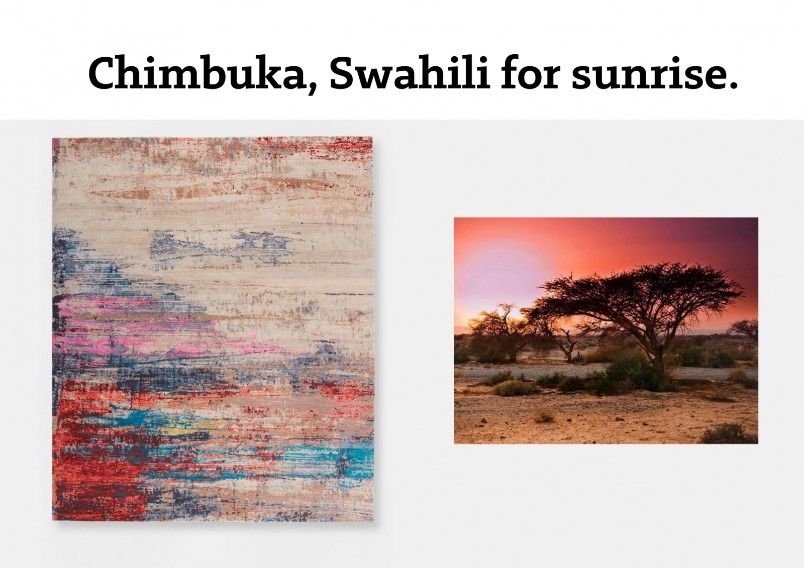 在非洲三大語言之一的斯瓦希里語裡有句名言:“好的開始寓意着好的結束”。“Chimbuka”的意思是日出。地毯圖案設計編排採用了強烈的紅色和藍色為主色調,猶如早晨和夕陽時分投射到天空中的明亮色彩一樣,形成大自然的幻化空靈之美。