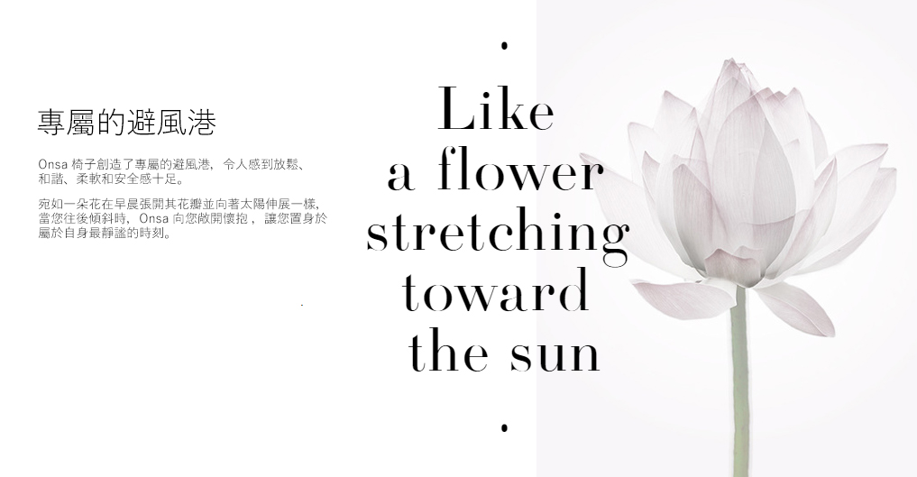 設計師受日本區域植物區系的啟發,重新詮釋日本美學,椅子宛如鬱金香在早晨張開其花瓣並向太陽延伸一樣,當你往後傾斜時,座椅外殼宛如花萼一樣打開,向您敞開懷抱,柔軟的內飾、高靠背和可調節高度的椅凳達到了完美的平衡,營造出放鬆、和諧、柔軟和安全感。