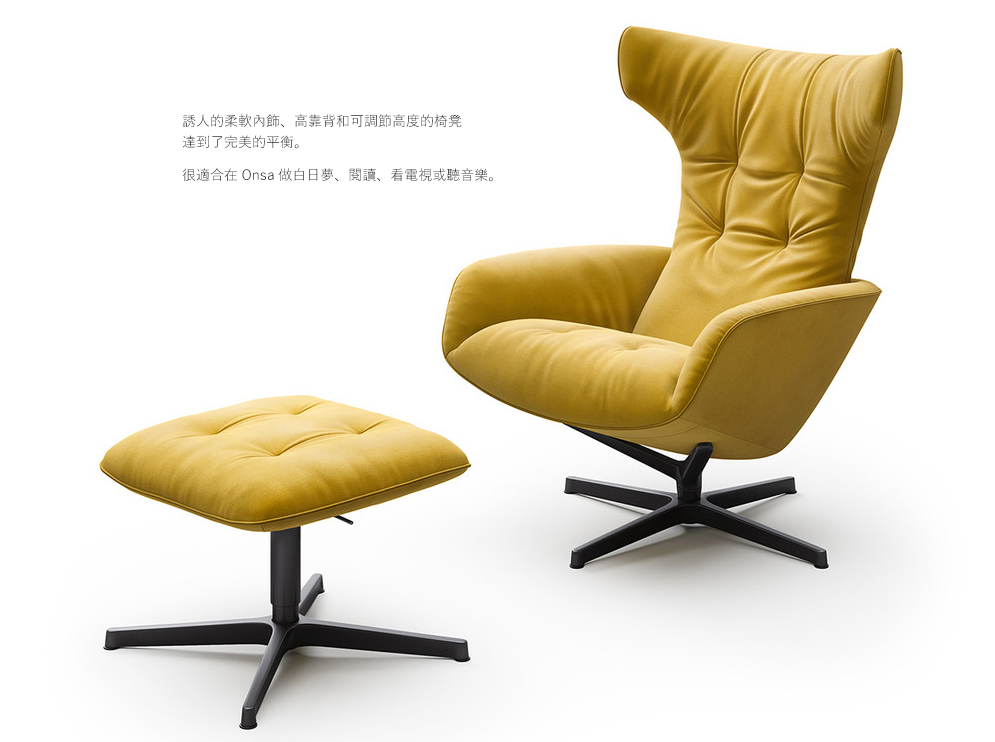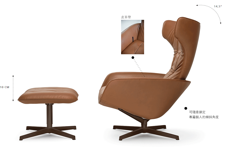 Onsa的傾斜度可以通過拉動皮革帶連續調節背部,不管停留在那個角度,扶手始終提供正確的支撐。
