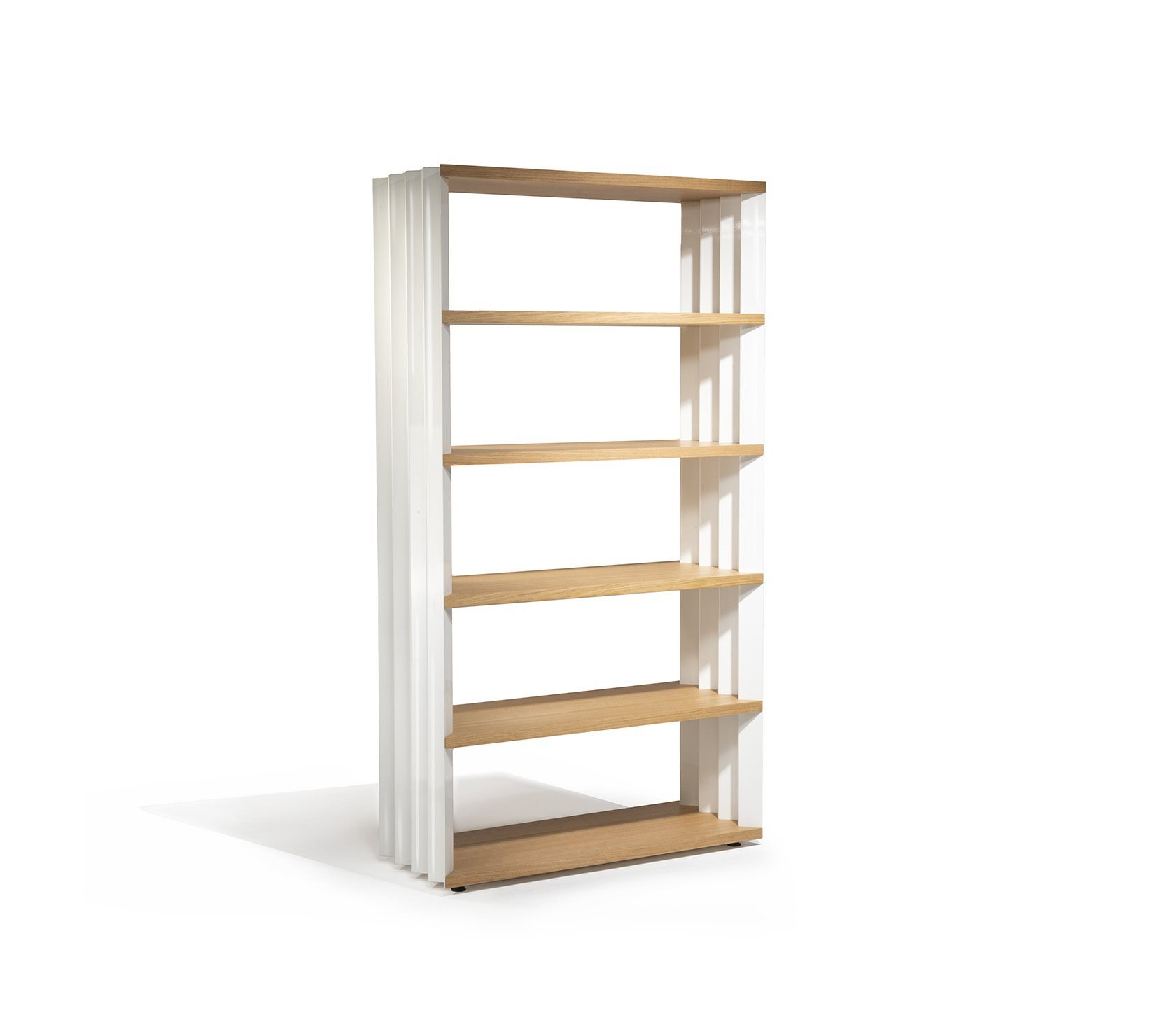 書櫃,結構為拋光塗裝鋼材,可選色包含 talc、caramel、orange、amaranth 與 algae。層板採用 MDF 覆天然橡木木皮,上透明保護漆。高版本可並排使用,另附連結件強化結構整合。