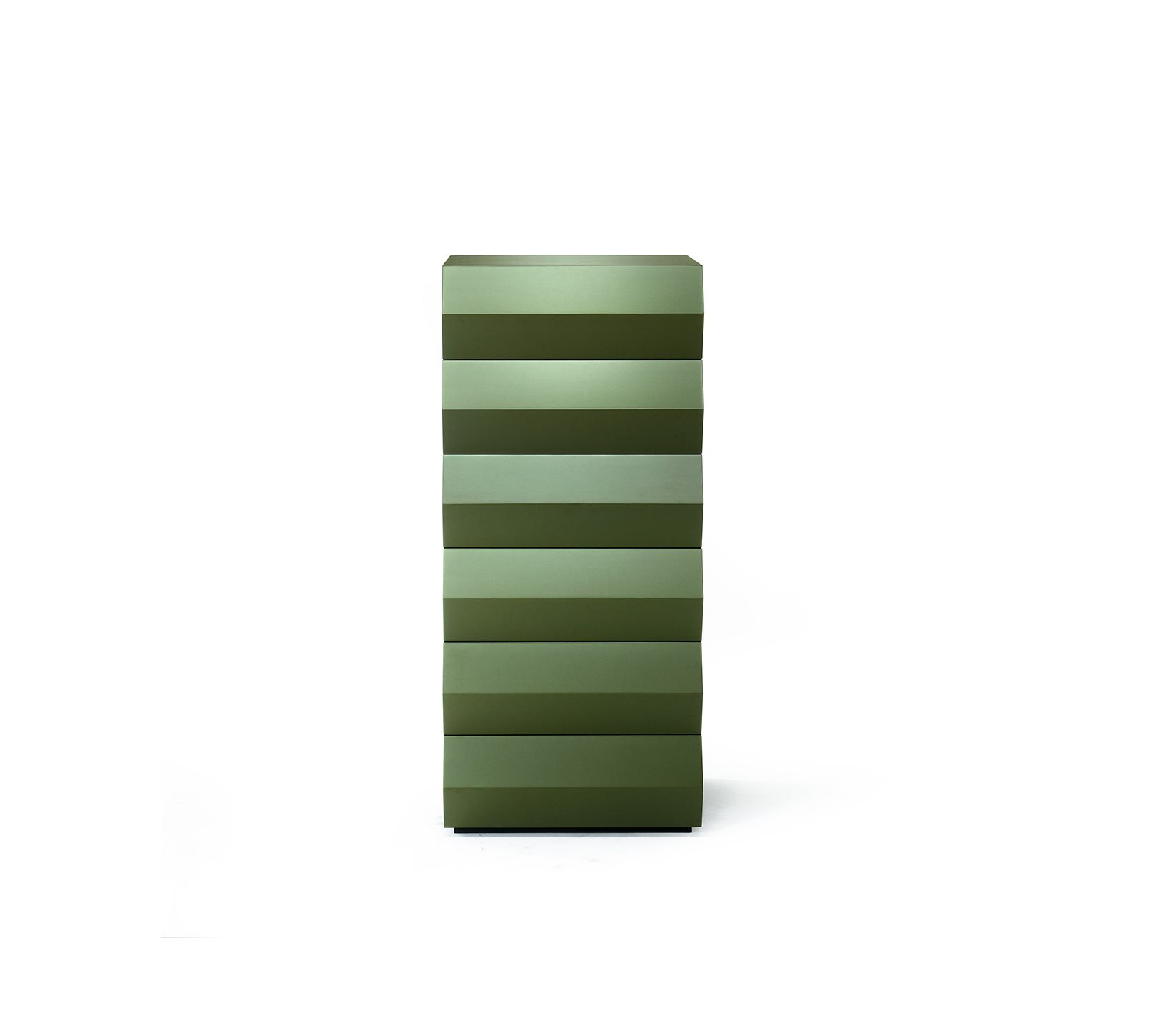 抽屜櫃,以 MDF 為本體,表面霧面漆處理,共九款配色:talc、wax、hemp、caramel、orange、amaranth、grass green、algae、espresso 與 black。