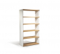 書櫃,結構為拋光塗裝鋼材,可選色包含 talc、caramel、orange、amaranth 與 algae。層板採用 MDF 覆天然橡木木皮,上透明保護漆。高版本可並排使用,另附連結件強化結構整合。